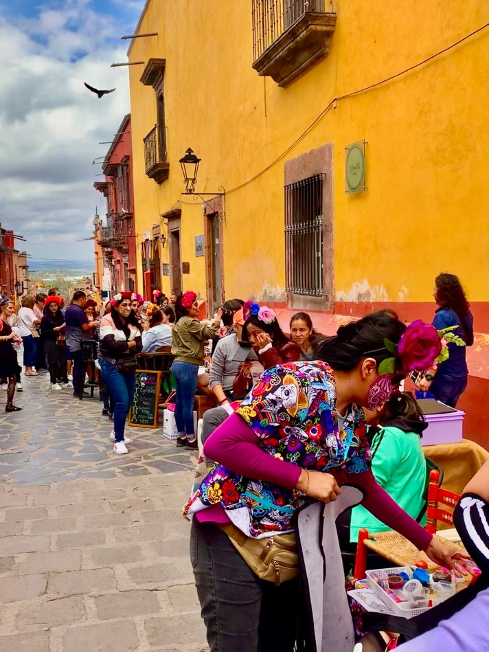If you haven’t made it to San Miguel (a beautiful colonial city in Mexico’s highlands) for the Day of the Dead party, lo siento… find your way here one day. Totally eccentric, eclectic, artistic (and potentially on the run) expats mixed with old Mexican tradition – can you say weird? Weird and fun and epic?! Be warned and well hydrated – this is more than a day! It appears there is a day dedicated to celebrating every dead person or thing… Here’s the warm up in el Jardin, first – get that face painted!